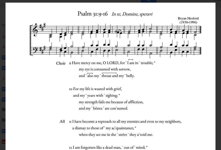 It actually worked out well for me because I have a ton of work to do to prepare for Holy Week. Most of this work is making psalms over again with Anglican Chant tones and using the pointing in the Anglican Chant Psalter.